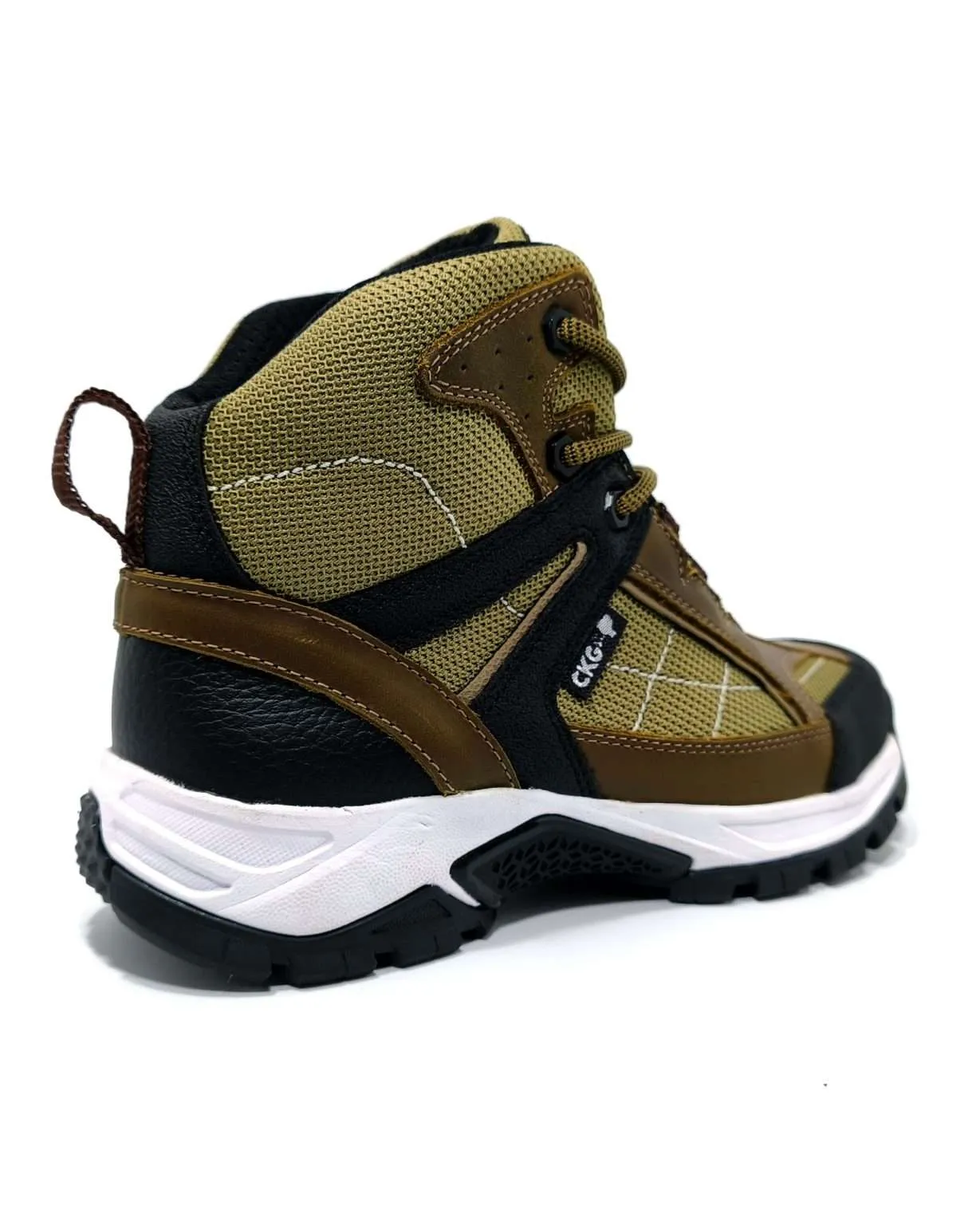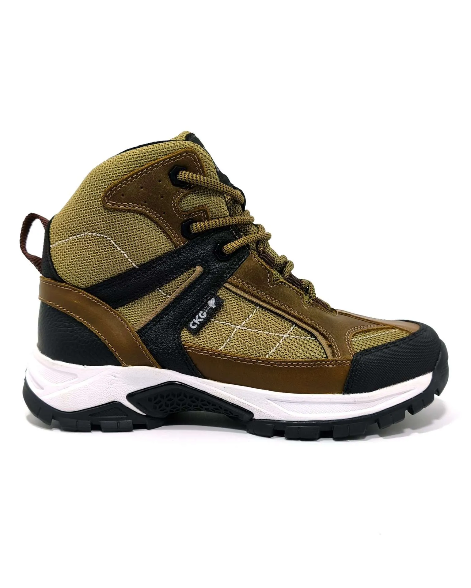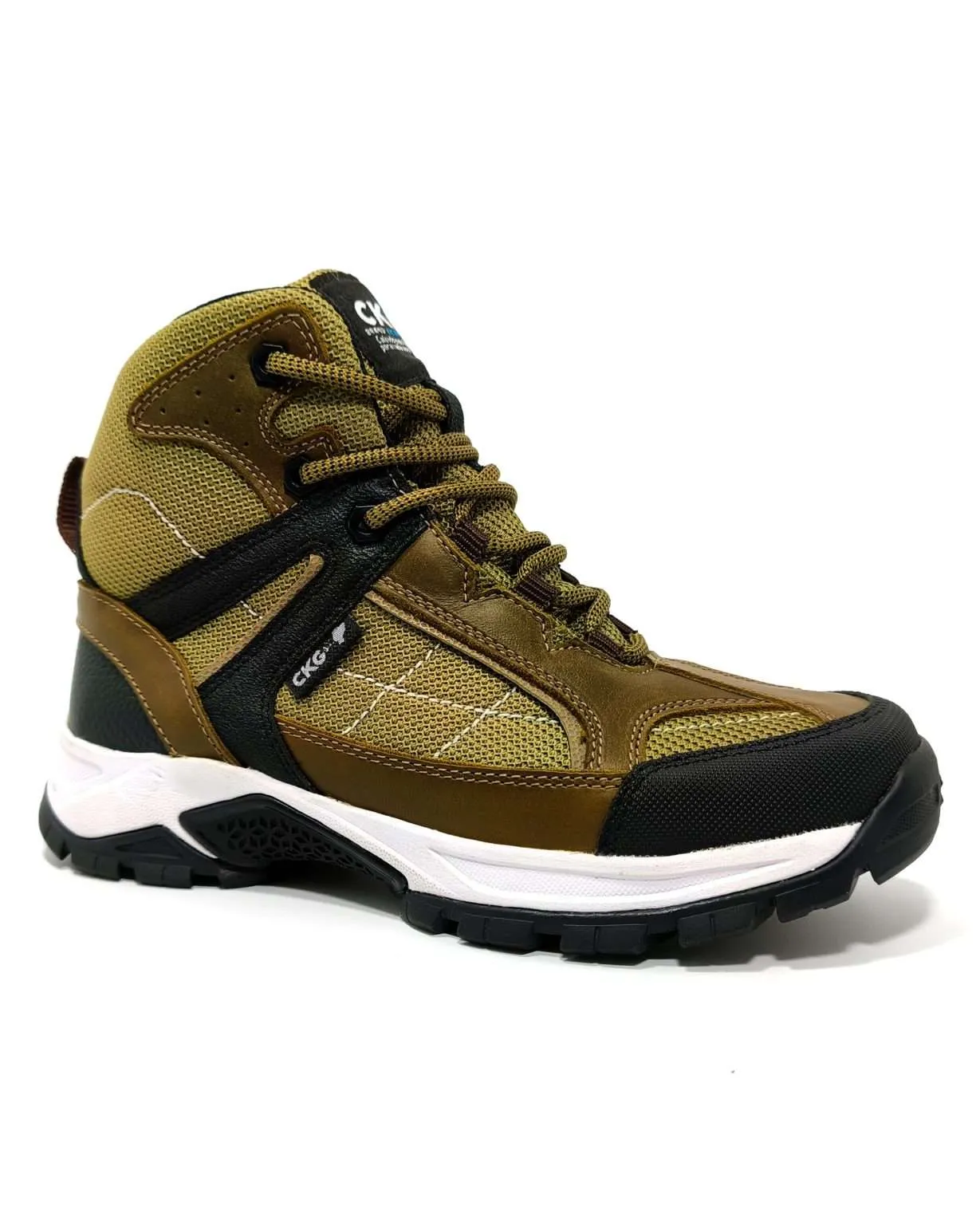 Capellada en textil técnico + refuerzos en EVA, cuero y material sintético estructural, lengüeta con fuelle integrado (evita ingreso de polvo y piedras)