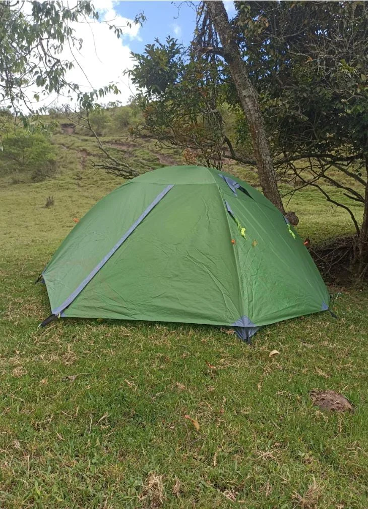 - Carpa 2-3 personas con palitroques de fibra de vidrio, 100% impermeable y costuras termo selladas para alturas de hasta 5400 m.