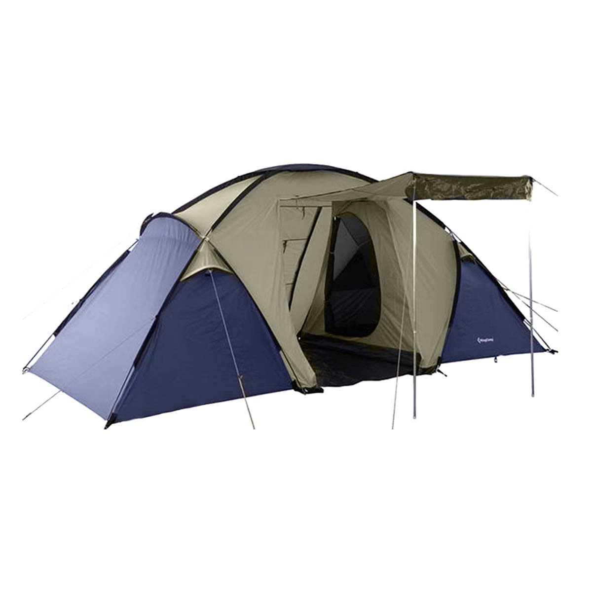 La carpa es ventilada y fresca. La malla de poliéster lo mantiene a salvo de los insectos y mosquitos más pequeños. La cubierta y el piso a prueba de agua hacen que la carpa sea resistente a la abrasión y al agua. Puede armar o desarmar la tienda en 5 minutos. Los bolsillos de almacenamiento de malla se utilizan para guardar objetos pequeños. Cuenta con dos habitaciones separadas y desmontables, un piso central extraíble en el pasillo le brinda un espacio interior más limpio. Las puertas delanteras y traseras sirven para dar una ventilación adicional a la carpa, la puerta con 2 postes metálicos puede formar un toldo que proporciona un lugar excelente para descansar.