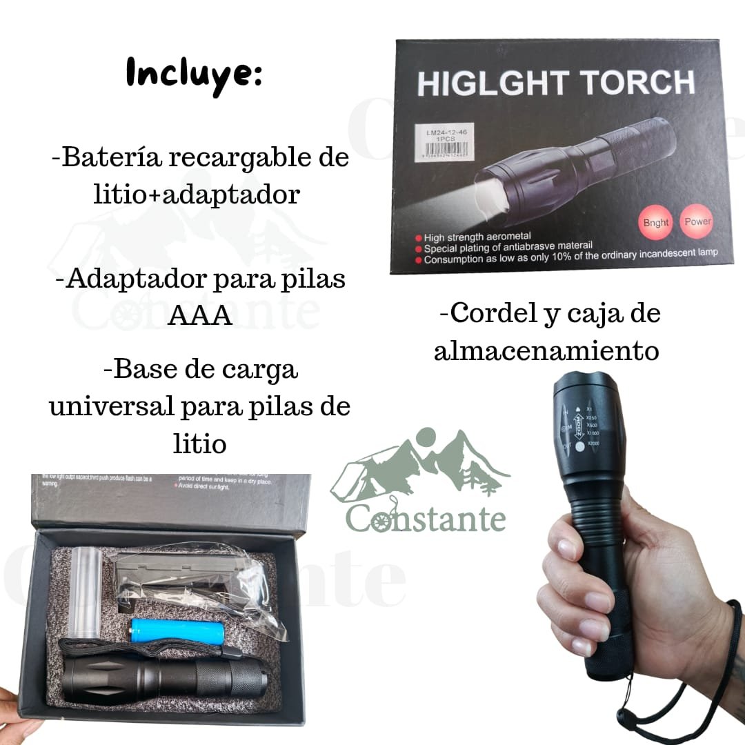 Esta linterna táctica de mano , es ideal para llevarla siempre contigo en tus aventuras al aire libre. esta fabricada con aleación de aluminio , resiste impactos , agua de baja densidad y corrosión .Incluye cable para cargar y 5 modos de iluminación: luz alta para máxima visibilidad, luz media , luz baja ,luz estroboscópica y luz SOS .Equipada con un sistema de enfoque deslizable Focus 1×2000, permite ajustar el haz de luz desde un punto focal intenso hasta una luz amplia, con un alcance de hasta 100 metros.