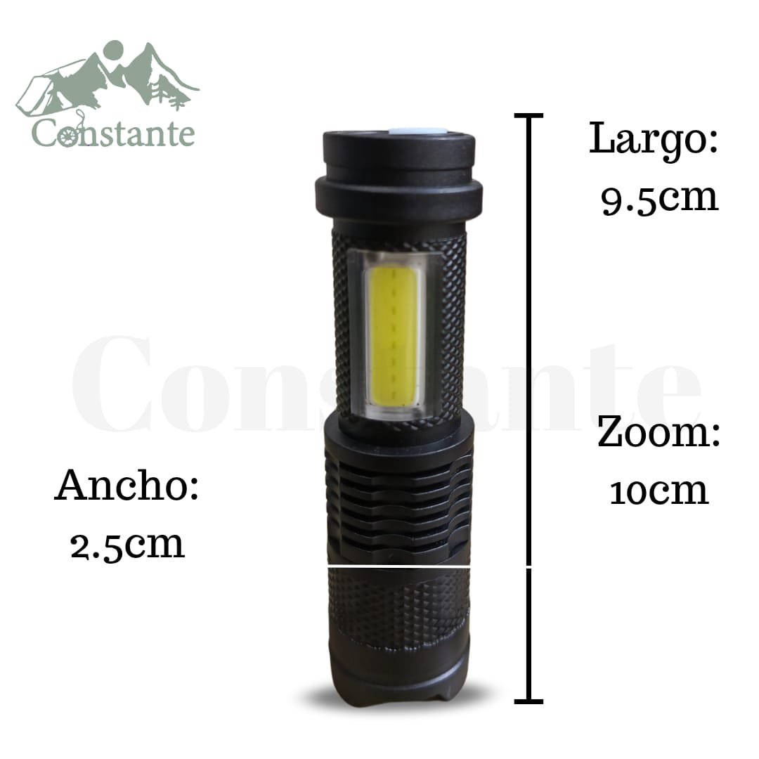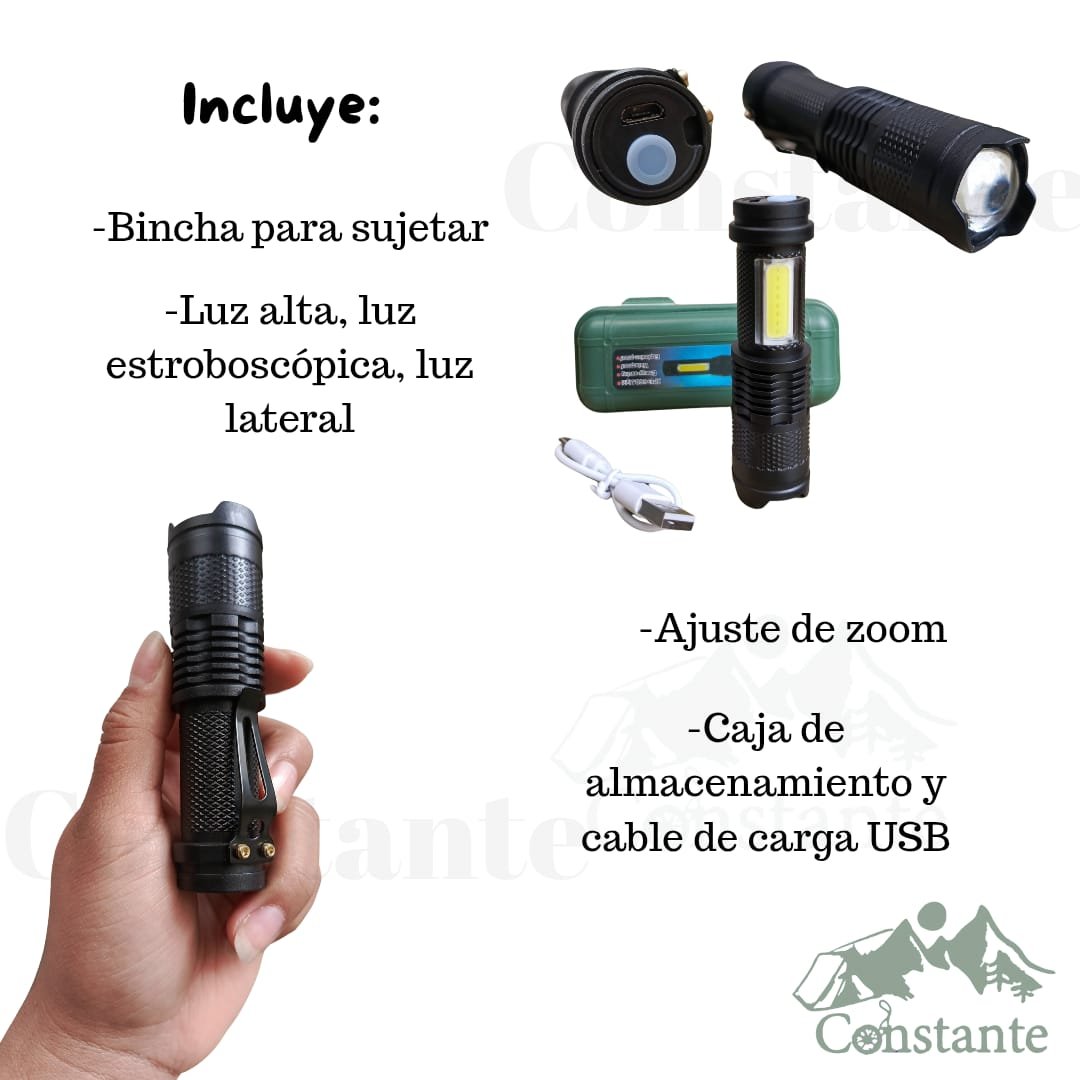 Cuenta con tres modos de iluminación: luz alta frontal, luz estroboscópica para señalización y una práctica luz lateral. El zoom ajustable permite enfocar o expandir el haz de luz según la necesidad.