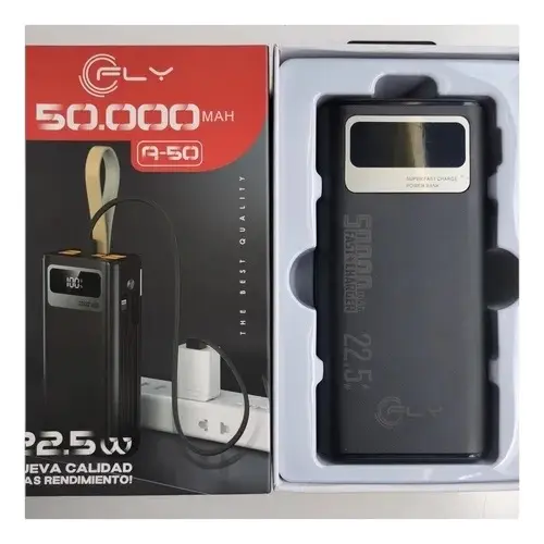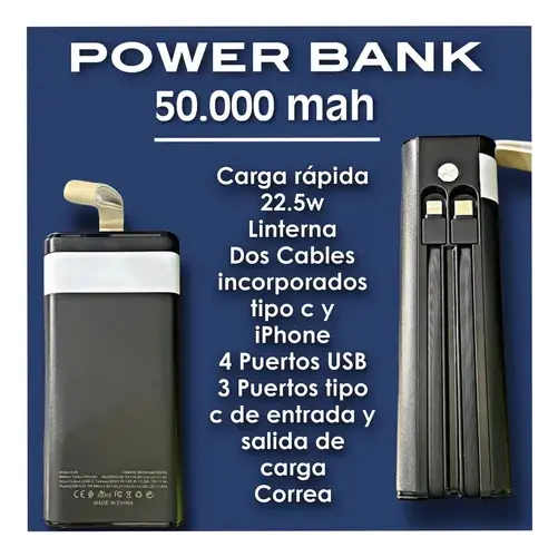 Pantalla LCD: La pantalla muestra el porcentaje restante exacto de la batería. Para encender la pantalla LCD, debe conectar el dispositivo al elemento y comenzar a cargar o hacer clic en el botón de encendido. Múltiples salidas: Este powerbank cuenta con 4 puertos de salida USB, uno para carga rápida, un puerto micro Usb, un puerto USB tipo C y un puerto Lightning para dispositivos Apple. Se puede compartir con amigos y cargar multiples dispositivos al mismo tiempo. Puedes recargar la batería con un cable Lightning o un USB tipo C. El cable de recarga está incluido en el paquete. Rápido, Seguro y Eficiente: los bancos de energía de 50000mAh con protecciones integradas admiten múltiples protocolos de carga para proteger sus dispositivos y teléfonos contra sobrecarga, sobrecalentamiento y corriente excesiva. Tamaño compacto y diseño fácil de viajar: los cargadores pueden caber en tu bolsillo o bolsa fácilmente y garantizar una portabilidad increíble dondequiera que vayas. Práctico para el hogar, oficina, avión, automóvil, camping y vacaciones. Linterna Led: Ilumina tu espacio con una útil luz led que se activa tocando el botón de encendido dos veces, con varias funciones que se activan tocando el botón de encendido.