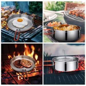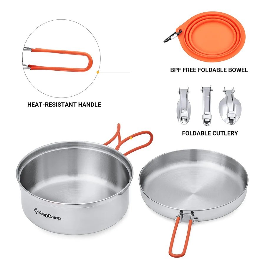 - Incluye 1 olla de 1.5L, 1 sarten, 3 platos, 1 taza de silicona mediana, 1 tazas de silicona pequeña, 2 juegos de cubiertos con estuche c/u, 2 mosquetones, 1 bolsa.