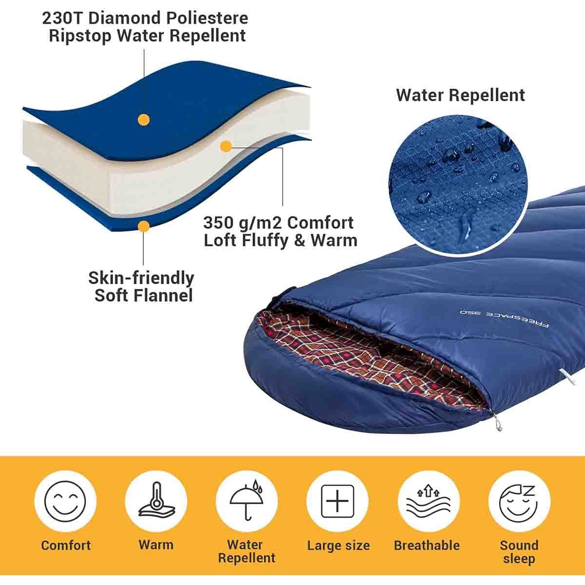 - Más grande y ancho que los sacos de dormir normales, nunca te preocupes al voltear en este saco de dormir.