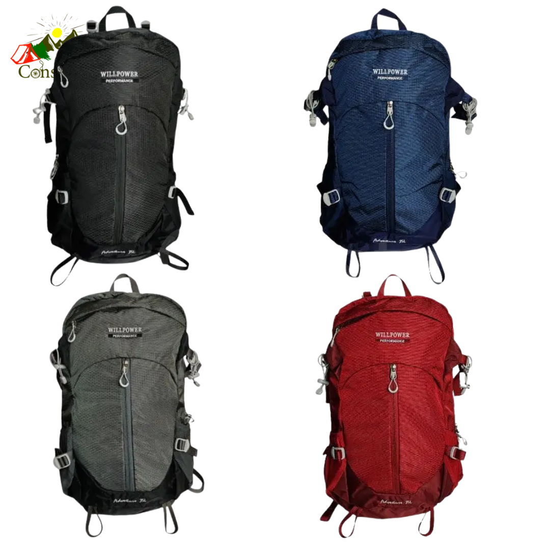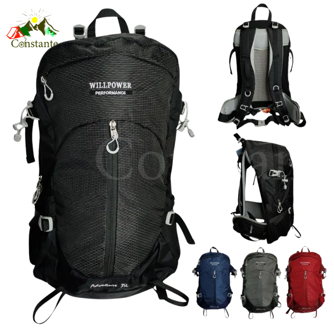Mochila Will Power de 35 litros, disponible al por mayor en varios colores. Fabricada con materiales resistentes y diseño ergonómico, incluye un silbato SOS y rain cover para mayor seguridad y protección en exteriores.